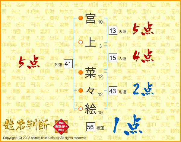 宮(10画)上(3画) 菜(12画)々(12画)絵(19画)