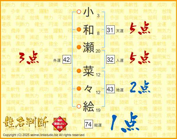 小(3画)和(8画)瀬(20画) 菜(12画)々(12画)絵(19画)