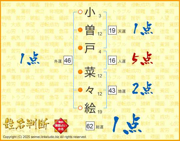 小(3画)曽(12画)戸(4画) 菜(12画)々(12画)絵(19画)