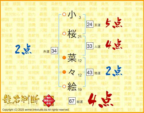 小(3画)桜(21画) 菜(12画)々(12画)絵(19画)