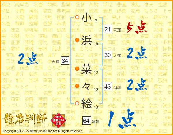 小(3画)浜(18画) 菜(12画)々(12画)絵(19画)