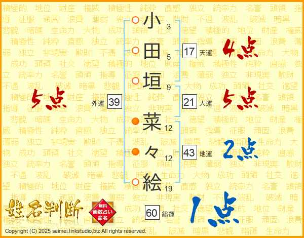 小(3画)田(5画)垣(9画) 菜(12画)々(12画)絵(19画)