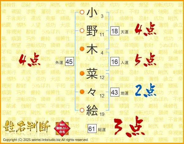小(3画)野(11画)木(4画) 菜(12画)々(12画)絵(19画)