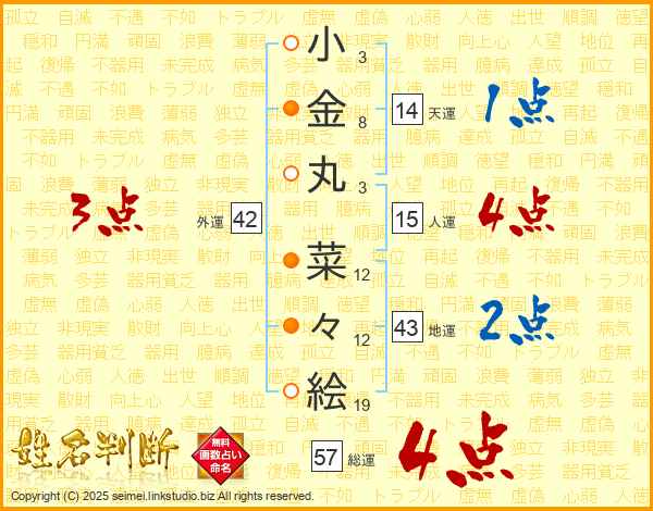 小(3画)金(8画)丸(3画) 菜(12画)々(12画)絵(19画)