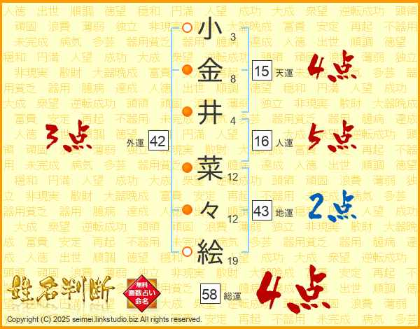 小(3画)金(8画)井(4画) 菜(12画)々(12画)絵(19画)