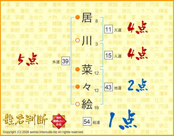 居(8画)川(3画) 菜(12画)々(12画)絵(19画)