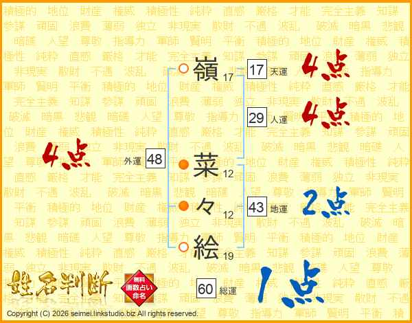 嶺(17画) 菜(12画)々(12画)絵(19画)
