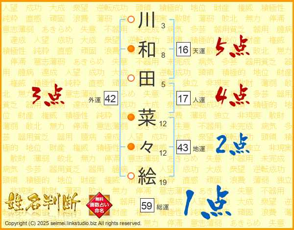 川(3画)和(8画)田(5画) 菜(12画)々(12画)絵(19画)
