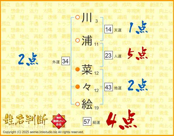 川(3画)浦(11画) 菜(12画)々(12画)絵(19画)
