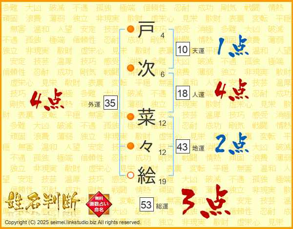 戸(4画)次(6画) 菜(12画)々(12画)絵(19画)