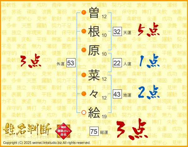 曽(12画)根(10画)原(10画) 菜(12画)々(12画)絵(19画)