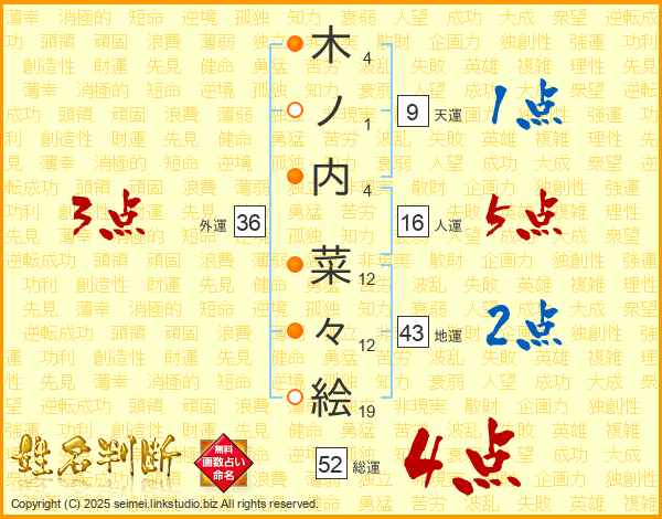 木(4画)ノ(1画)内(4画) 菜(12画)々(12画)絵(19画)