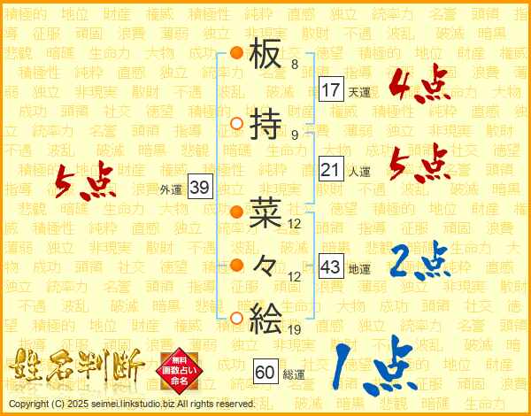 板(8画)持(9画) 菜(12画)々(12画)絵(19画)