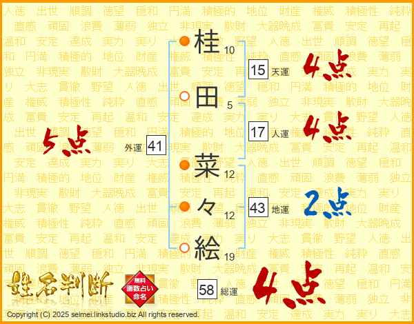 桂(10画)田(5画) 菜(12画)々(12画)絵(19画)