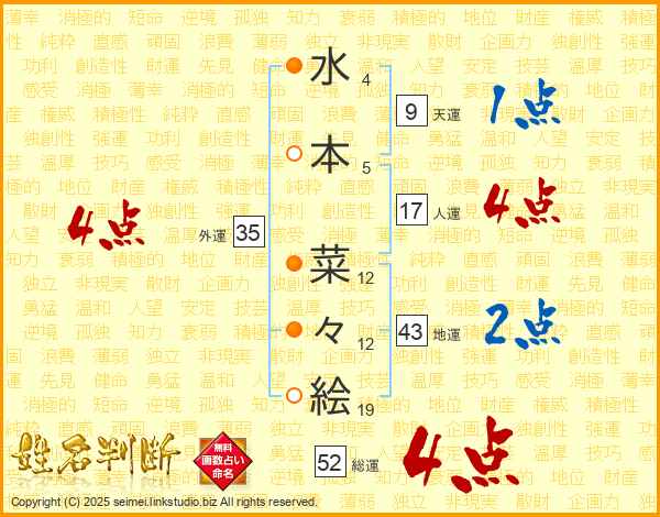 水(4画)本(5画) 菜(12画)々(12画)絵(19画)