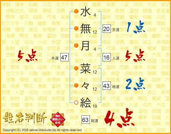 水(4画)無(12画)月(4画) 菜(12画)々(12画)絵(19画)