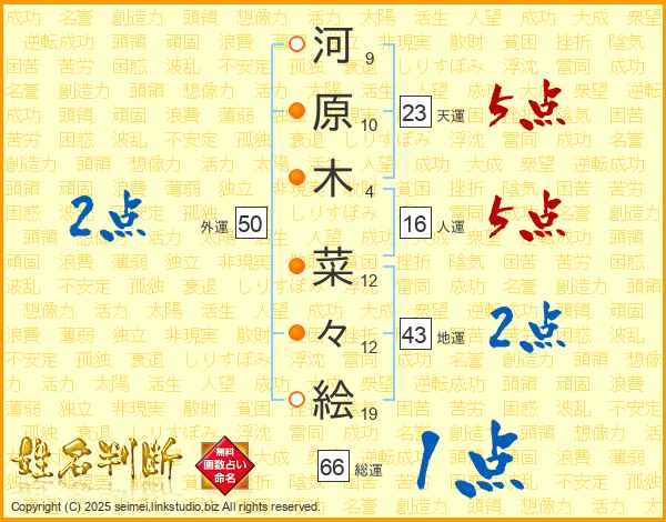 河(9画)原(10画)木(4画) 菜(12画)々(12画)絵(19画)
