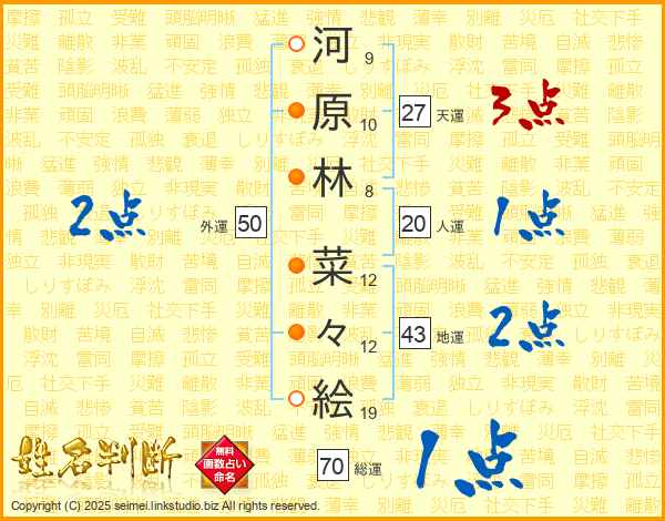 河(9画)原(10画)林(8画) 菜(12画)々(12画)絵(19画)