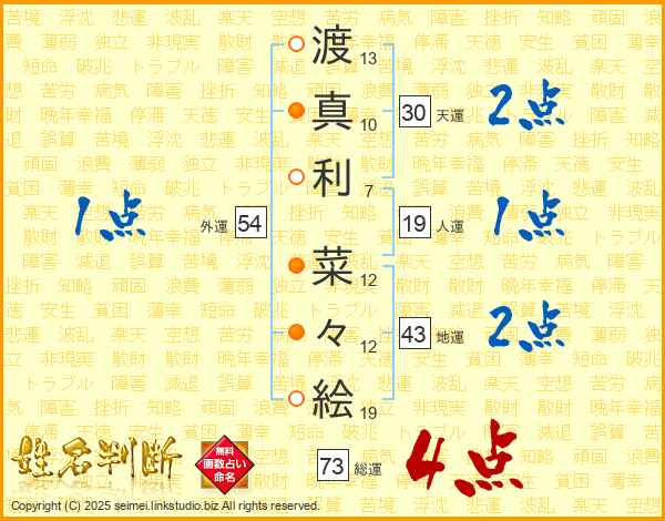 渡(13画)真(10画)利(7画) 菜(12画)々(12画)絵(19画)