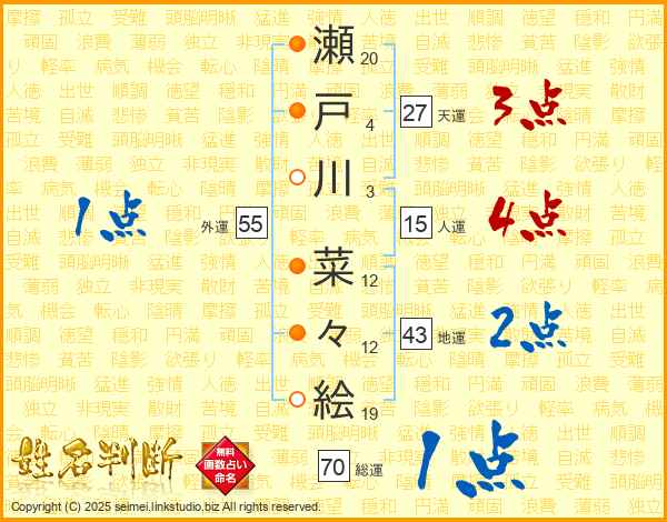 瀬(20画)戸(4画)川(3画) 菜(12画)々(12画)絵(19画)