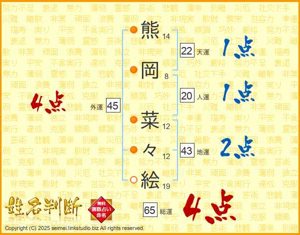 熊(14画)岡(8画) 菜(12画)々(12画)絵(19画)