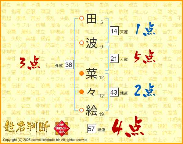 田(5画)波(9画) 菜(12画)々(12画)絵(19画)