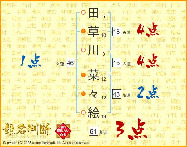 田(5画)草(10画)川(3画) 菜(12画)々(12画)絵(19画)