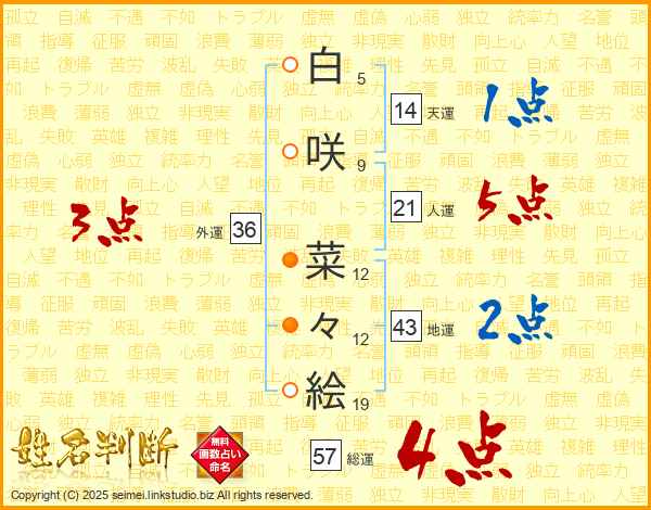 白(5画)咲(9画) 菜(12画)々(12画)絵(19画)