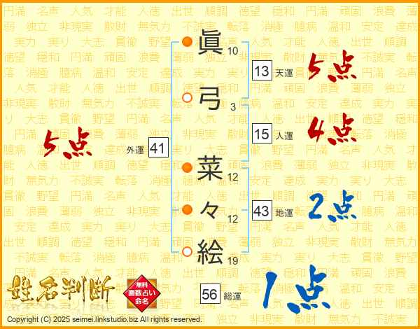 眞(10画)弓(3画) 菜(12画)々(12画)絵(19画)