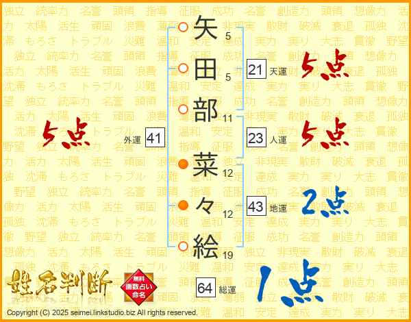 矢(5画)田(5画)部(11画) 菜(12画)々(12画)絵(19画)