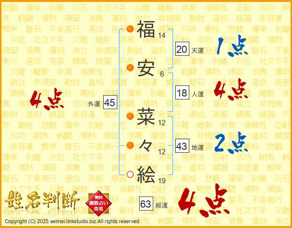 福(14画)安(6画) 菜(12画)々(12画)絵(19画)