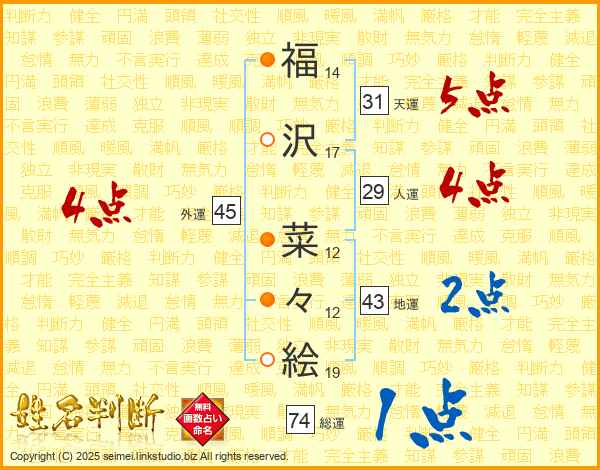 福(14画)沢(17画) 菜(12画)々(12画)絵(19画)