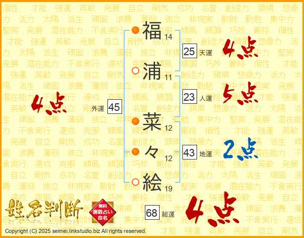 福(14画)浦(11画) 菜(12画)々(12画)絵(19画)