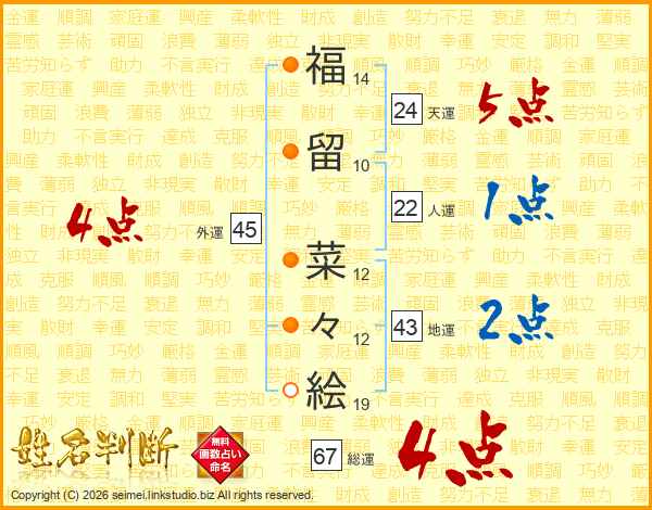 福(14画)留(10画) 菜(12画)々(12画)絵(19画)