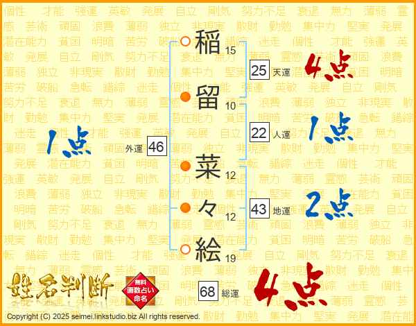 稲(15画)留(10画) 菜(12画)々(12画)絵(19画)