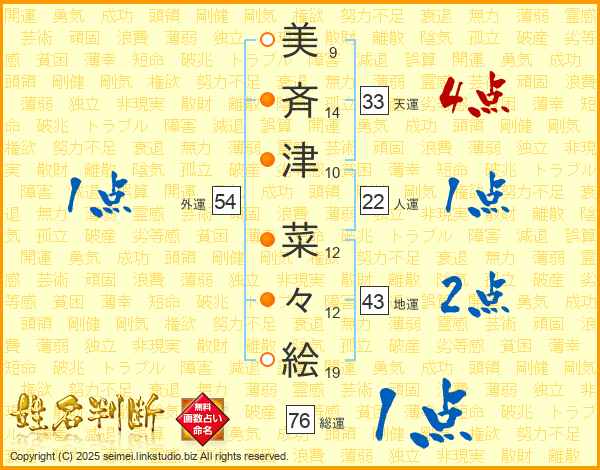 美(9画)斉(14画)津(10画) 菜(12画)々(12画)絵(19画)