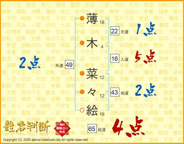 薄(18画)木(4画) 菜(12画)々(12画)絵(19画)