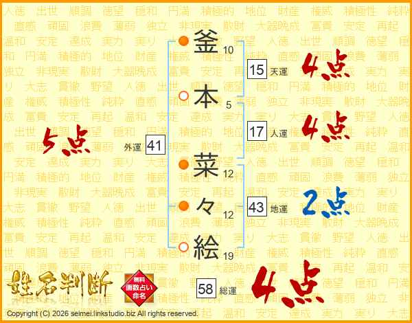 生活面を象徴する運勢です。外部から受ける影響力を表し、結婚運、家庭運や職場、環境への順応性を表します。総運から人運を引いた画数。姓や名が1文字の場合を除く。