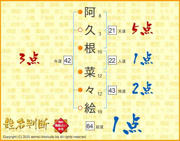 阿(8画)久(3画)根(10画) 菜(12画)々(12画)絵(19画)