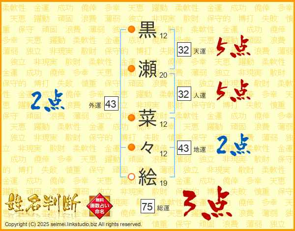黒(12画)瀬(20画) 菜(12画)々(12画)絵(19画)