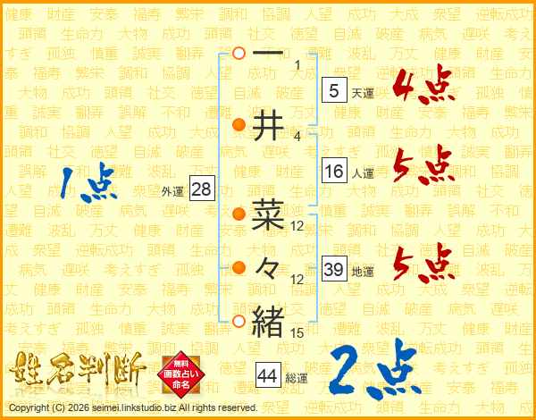 一(1画)井(4画) 菜(12画)々(12画)緒(15画)