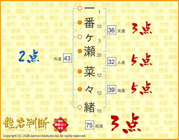 一番ヶ瀬菜々緒さんの総運は75画の3点!