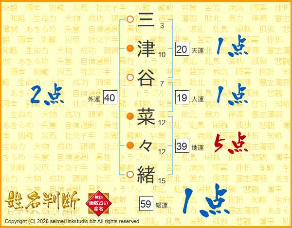 三(3画)津(10画)谷(7画) 菜(12画)々(12画)緒(15画)