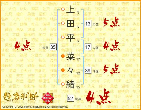 上田平菜々緒さんの総運は52画の4点!