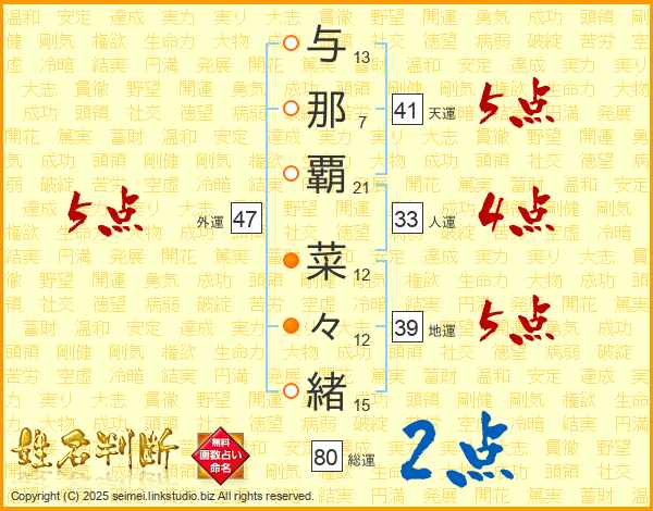 与(13画)那(7画)覇(21画) 菜(12画)々(12画)緒(15画)