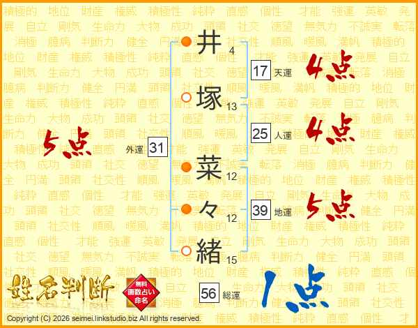 井(4画)塚(13画) 菜(12画)々(12画)緒(15画)