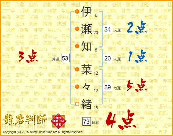 伊(6画)瀬(20画)知(8画) 菜(12画)々(12画)緒(15画)