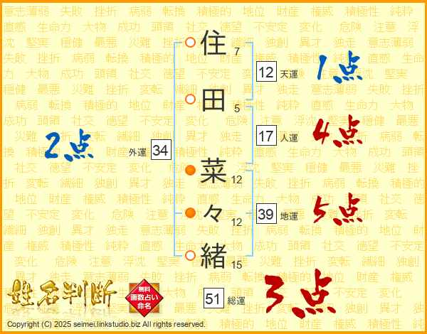 住(7画)田(5画) 菜(12画)々(12画)緒(15画)