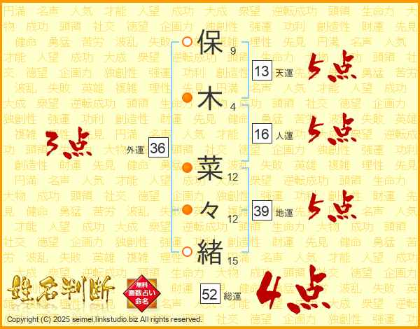 保(9画)木(4画) 菜(12画)々(12画)緒(15画)