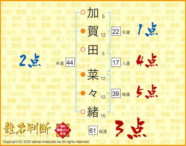 加(5画)賀(12画)田(5画) 菜(12画)々(12画)緒(15画)